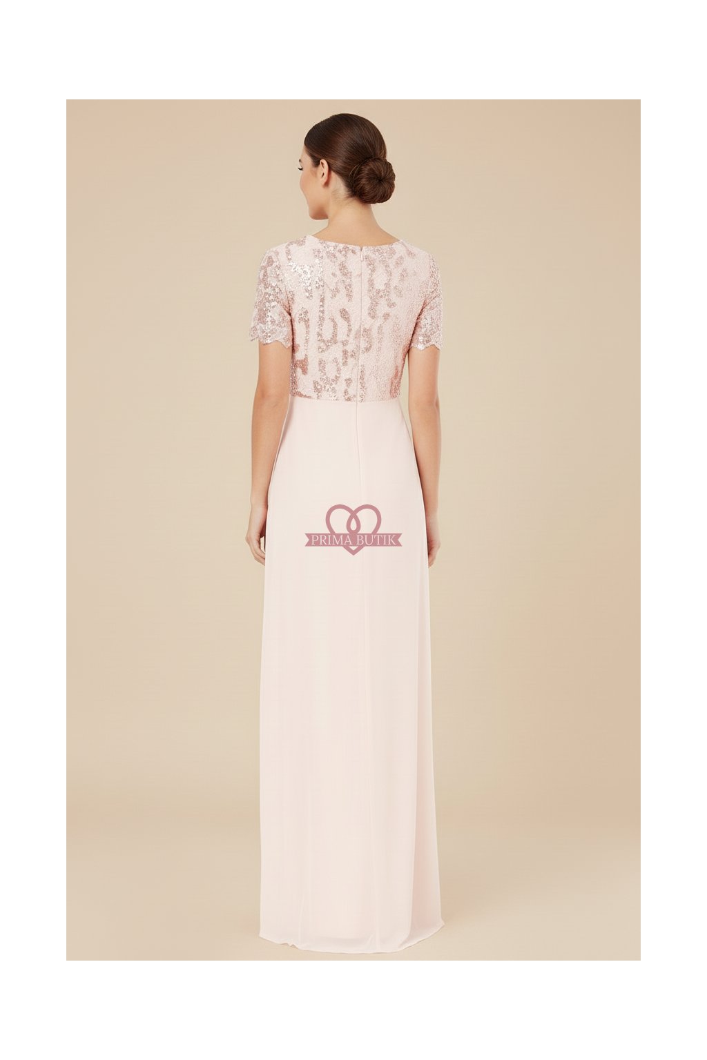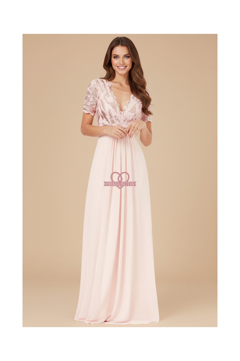 Dámské dlouhé plesové šaty s krátkým rukávem a výstřihem do V v módní tělové barvě. Šaty mají vrchní část z krajky, která je zdobená flitry a sukně je šifónová.Dále mají podšívku a zipové zapínání vzadu. Nádherné plesové šaty v kterých zazáříte.