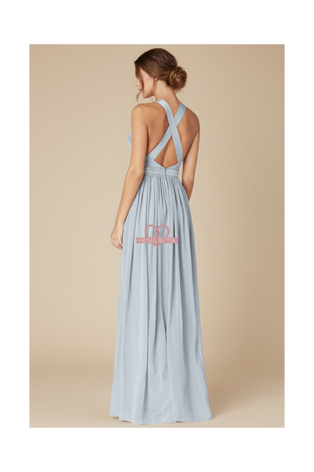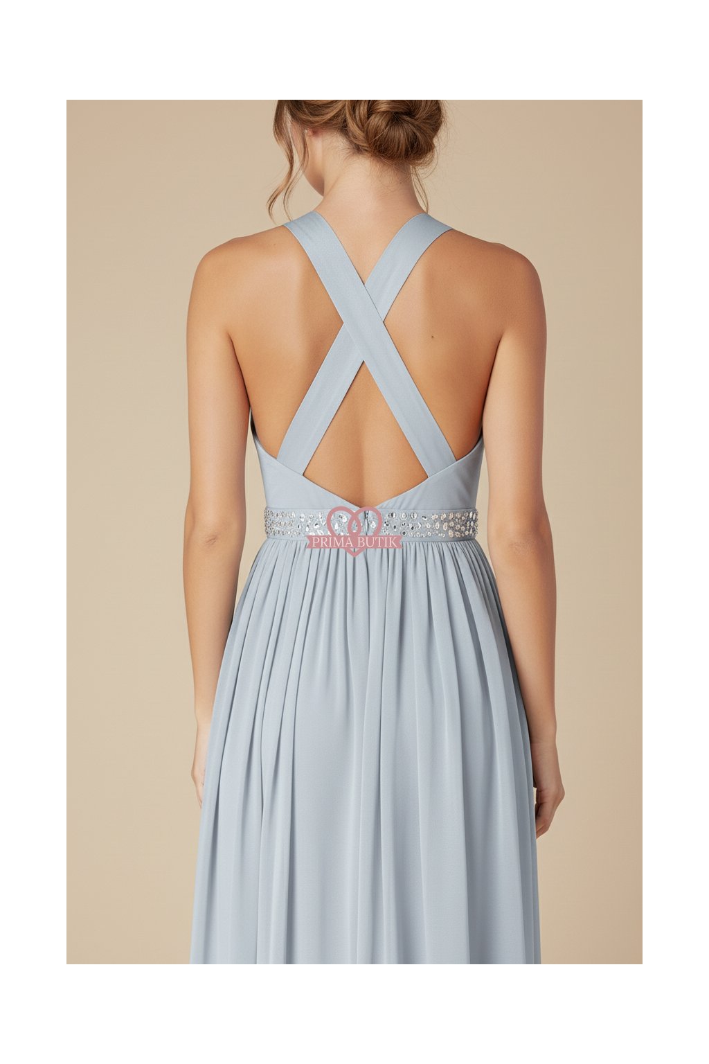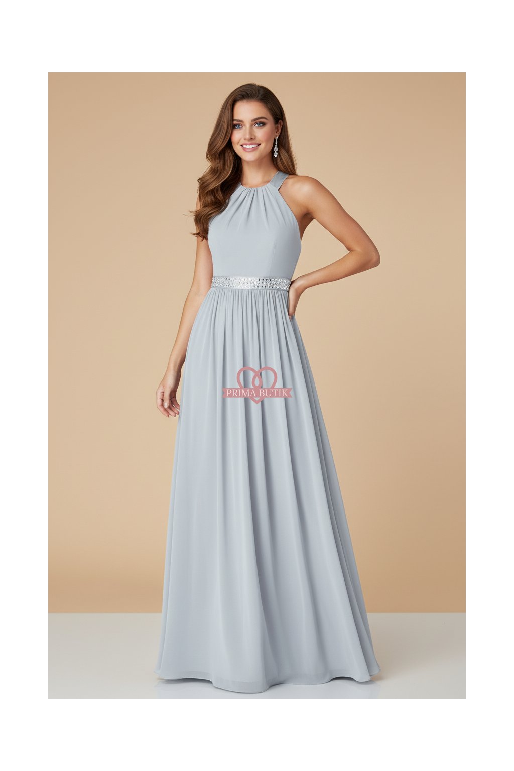 Dámské dlouhé plesové šifónové šaty za krk. Šaty jsou na zádech překřížené a jsou zdobené kamínky v pase. Dále mají podšívku a zipové zapínání vzadu.