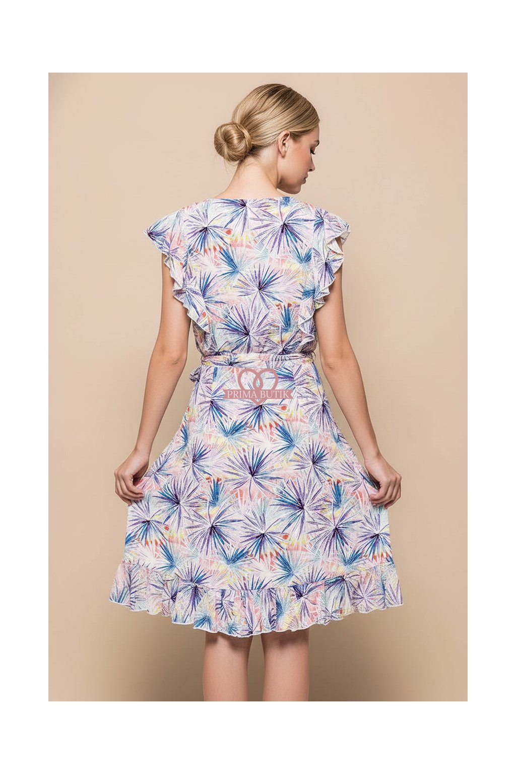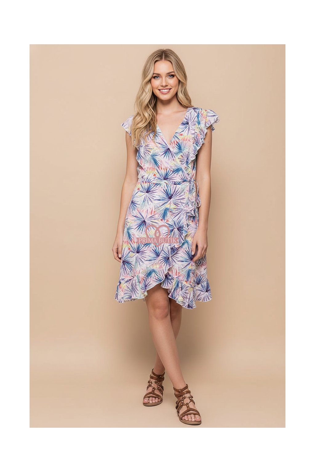 Krátké letní zavinovací šaty v květovaném vzoru s volánky.