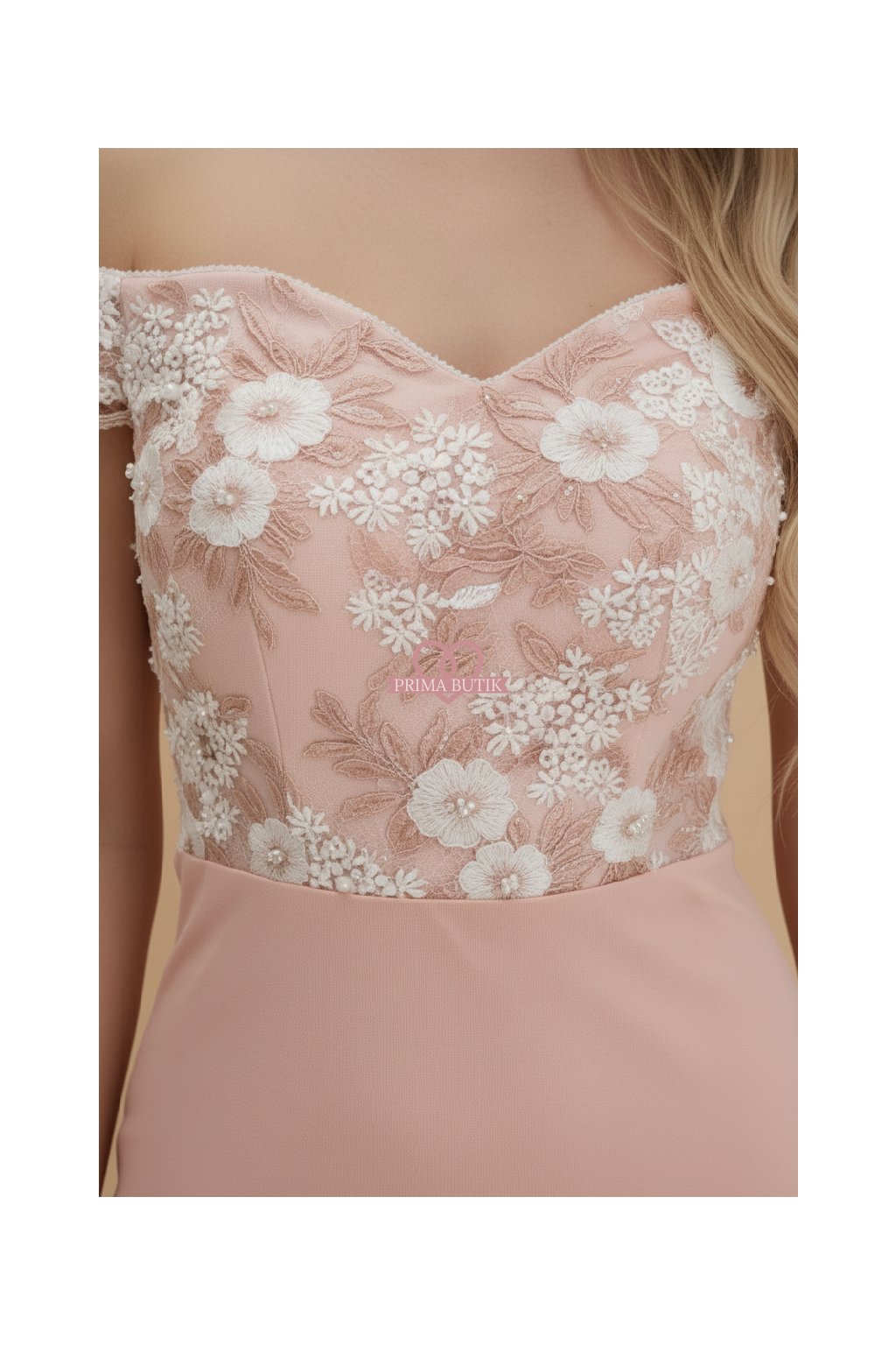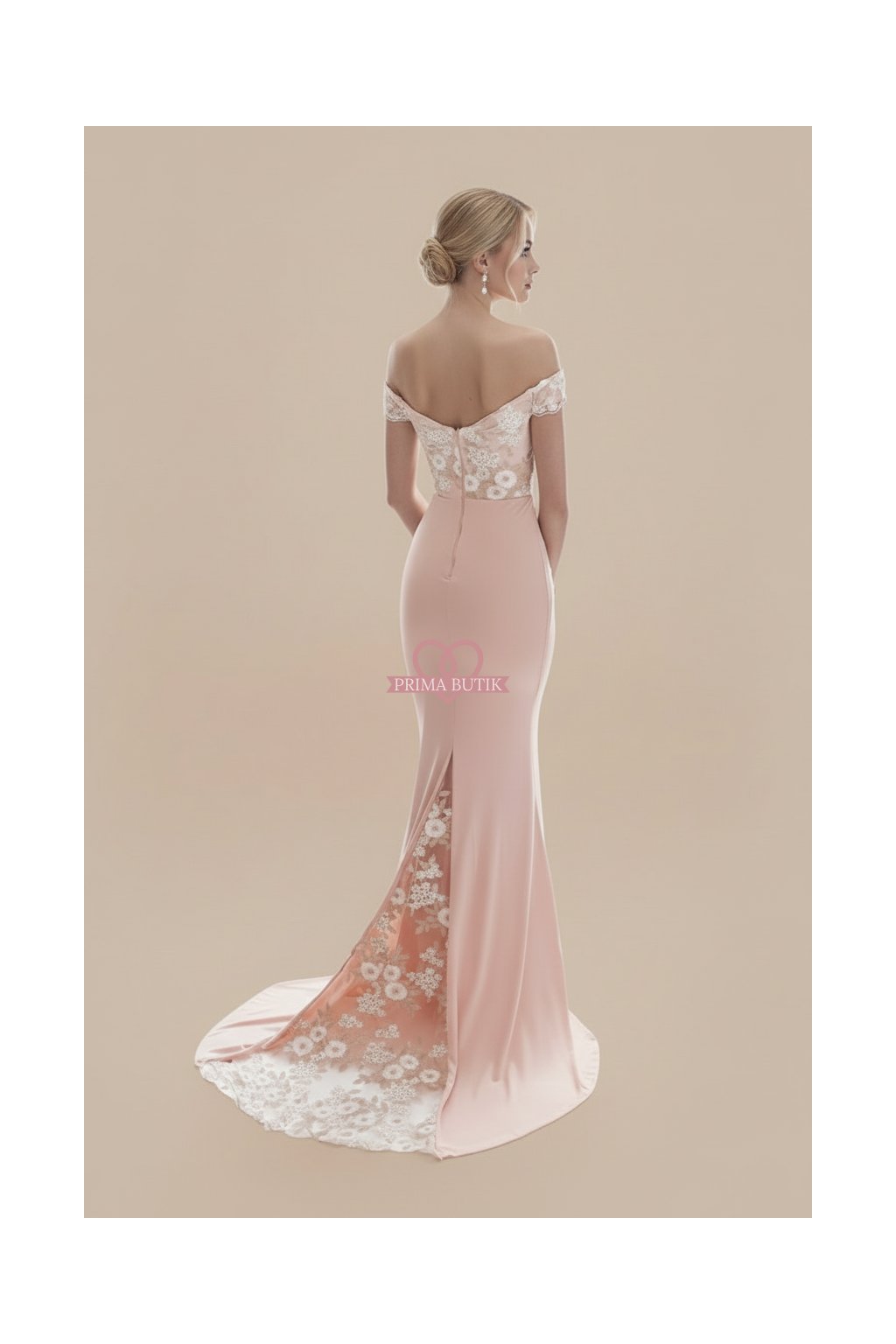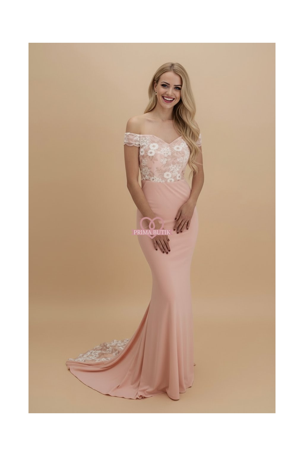 Společenské dlouhé šaty s odhalenými rameny. Šaty mají zdobený top a vlečku. Šaty mají od kolenou rozšířenou sukni.