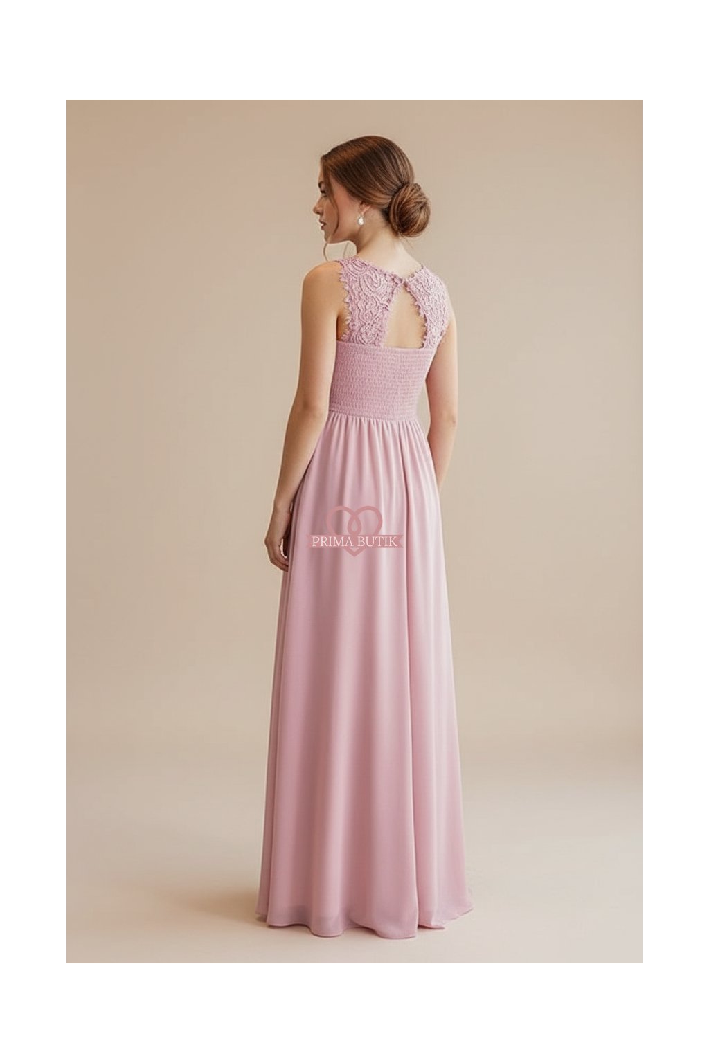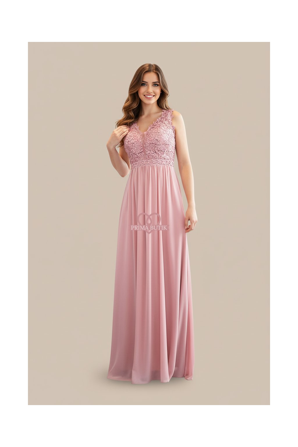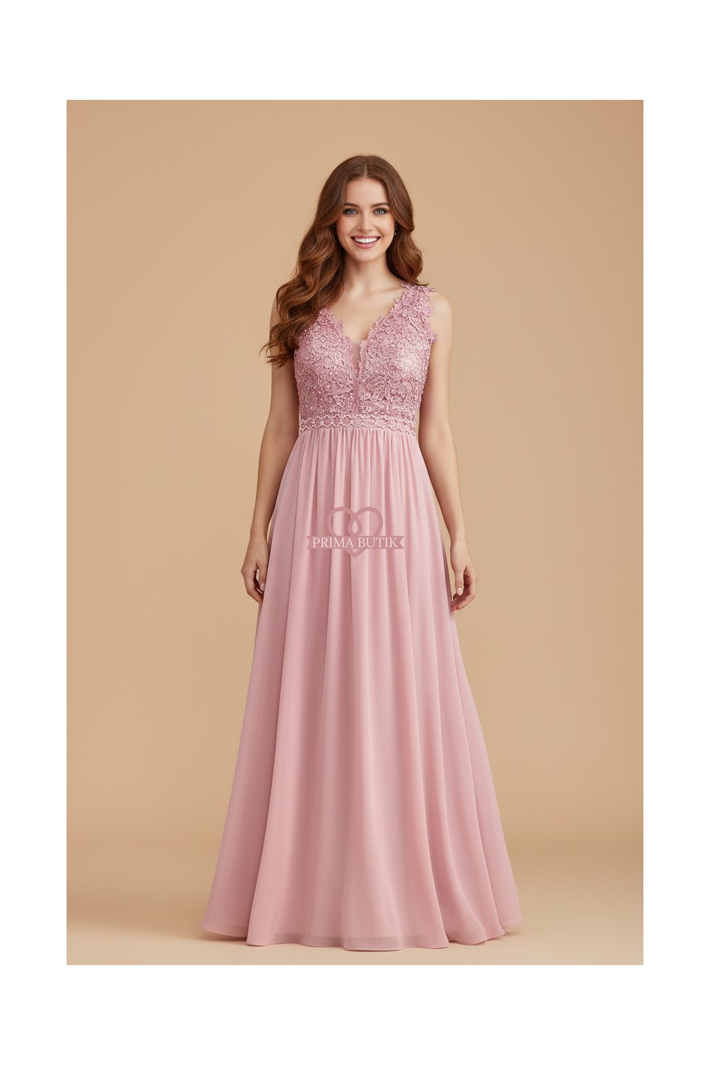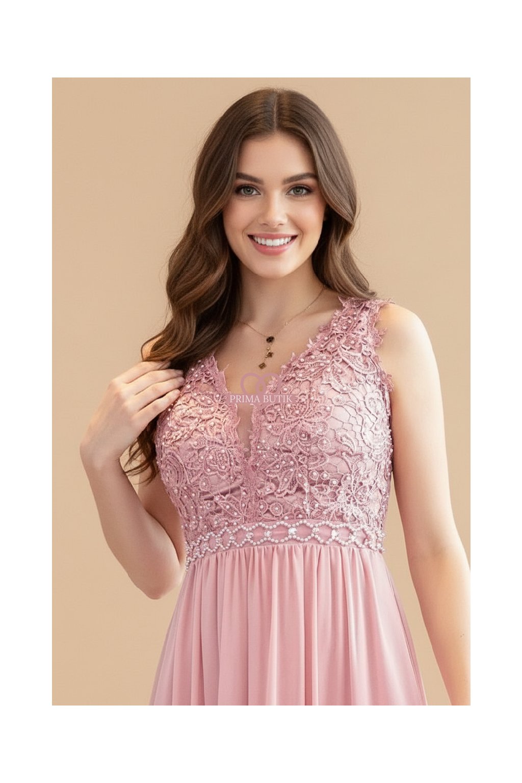 Dlouhé společenské šaty bez rukávů zdobené krajkou. Šaty mají krajkový top a šifonovou sukni a odhalená záda.
