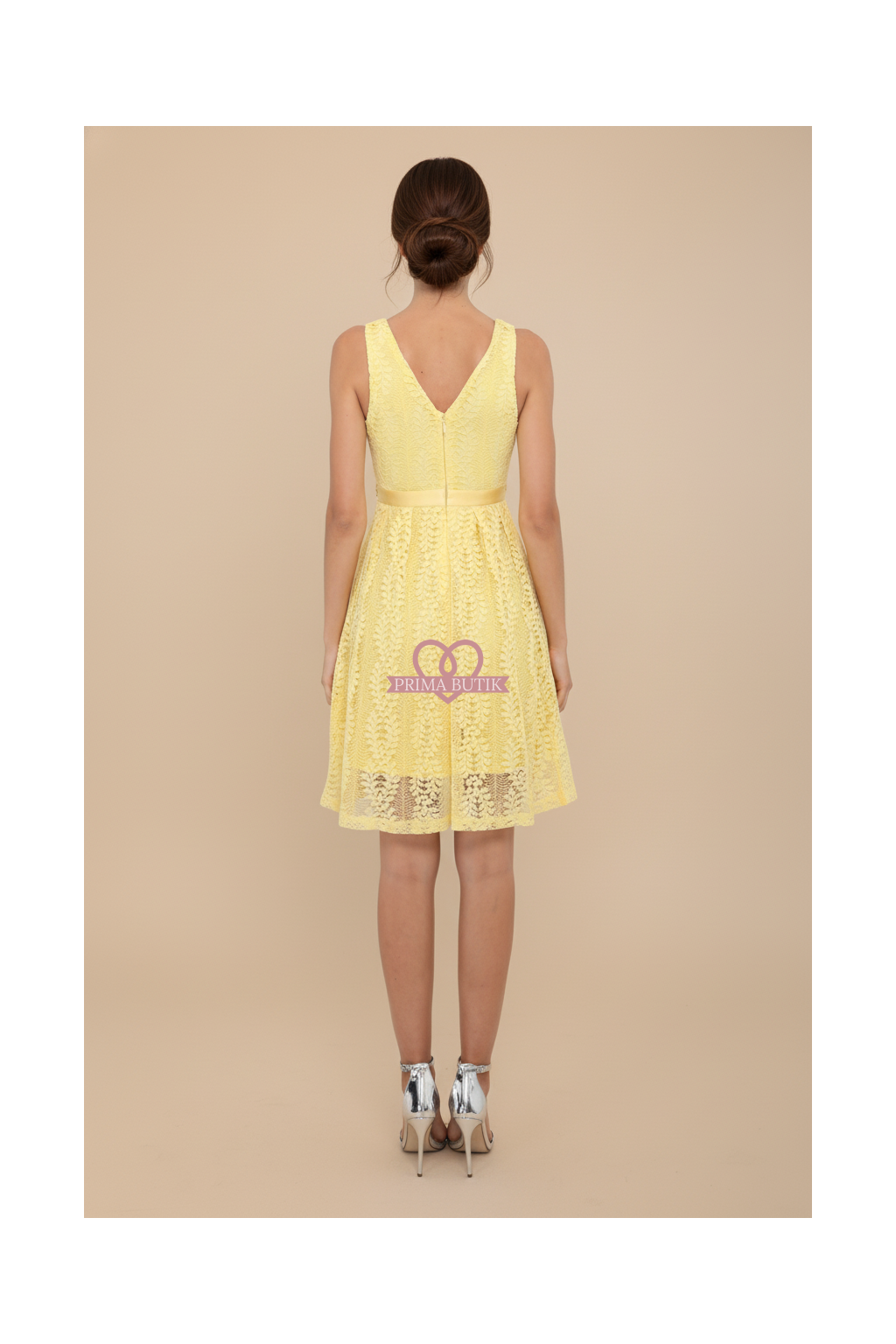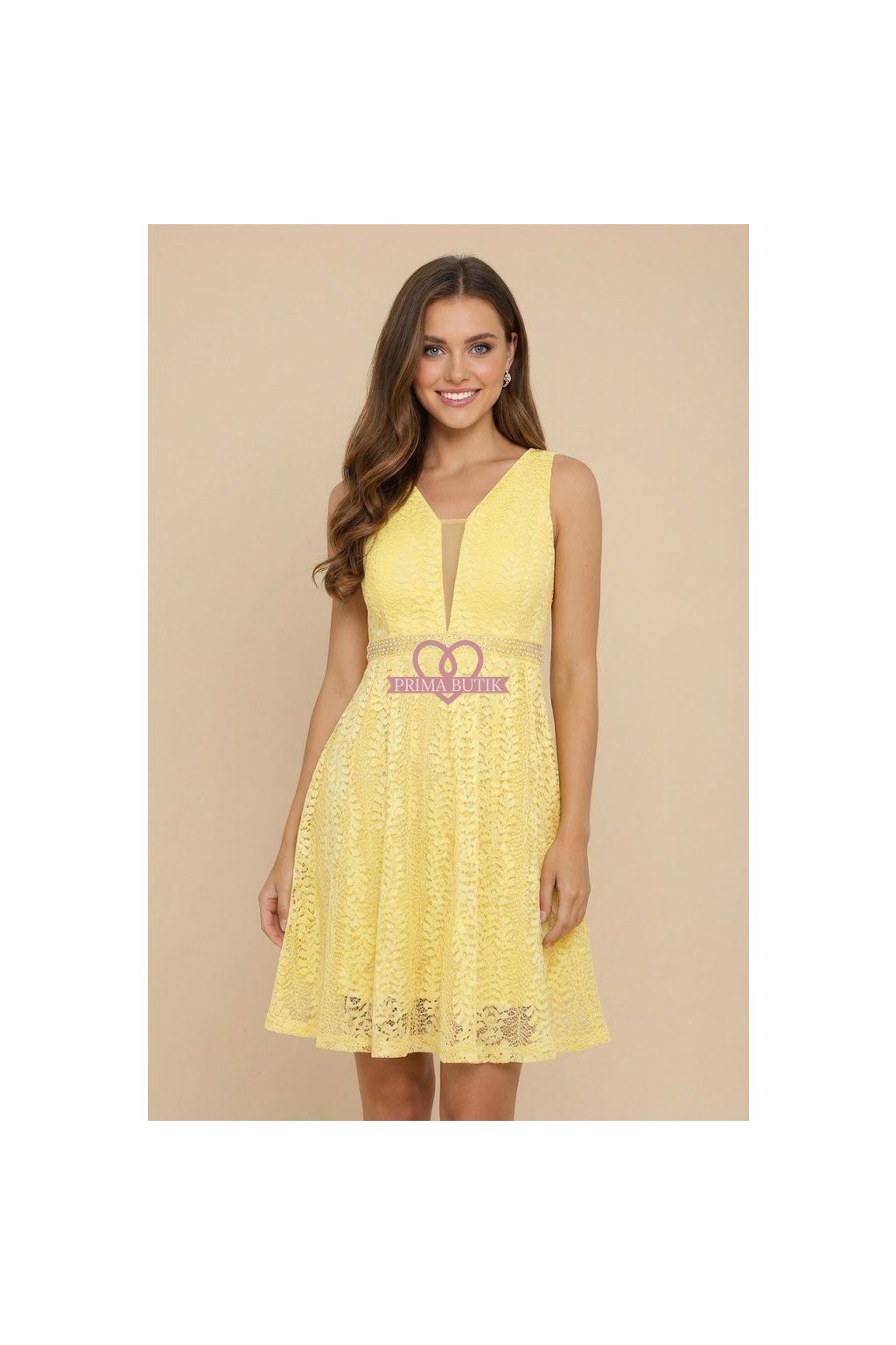 Společenské koktejlové krajkové žluté šaty se zdobeným pasem.