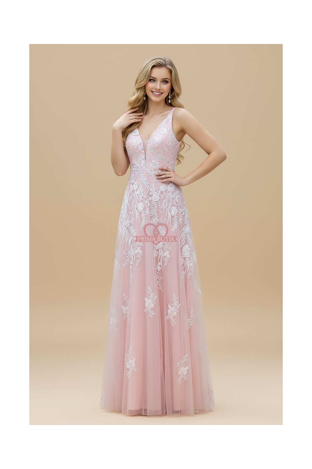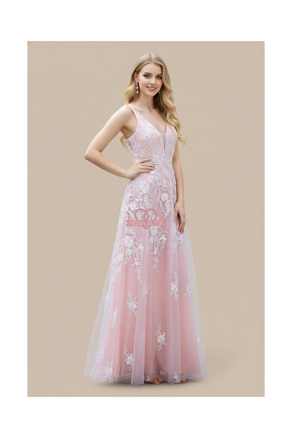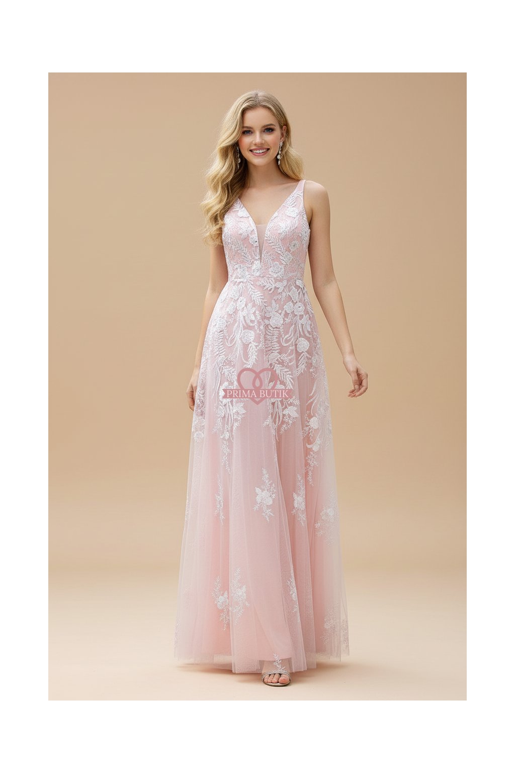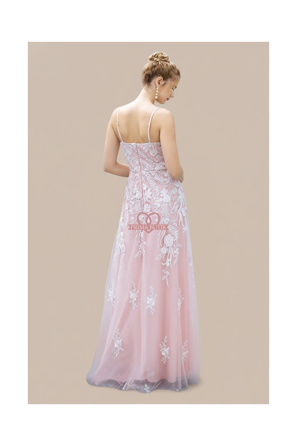 Dlouhé společenské šaty pro družičky s krajkovou aplikací Šaty mají zdobený top a rozšířenou sukni. Odhalená záda a v dekoltu nejsou šaty vyztužené.