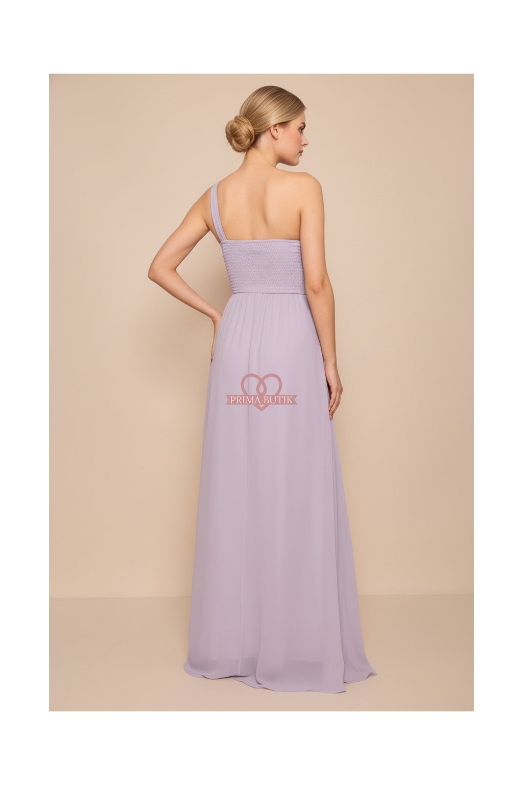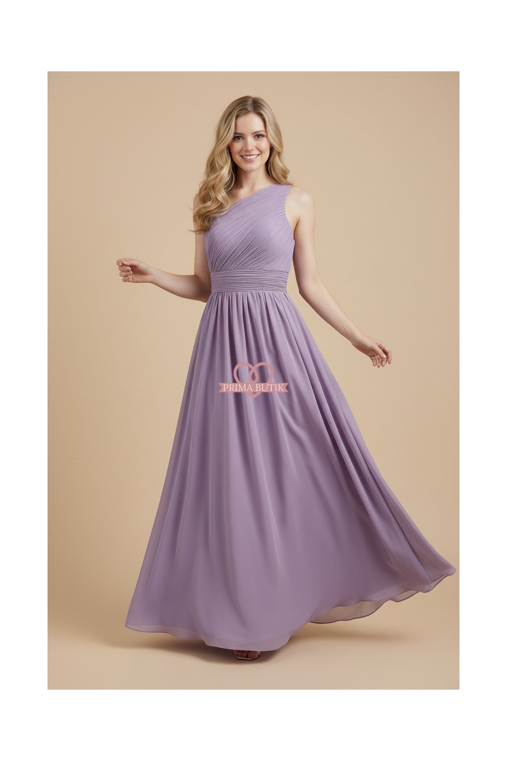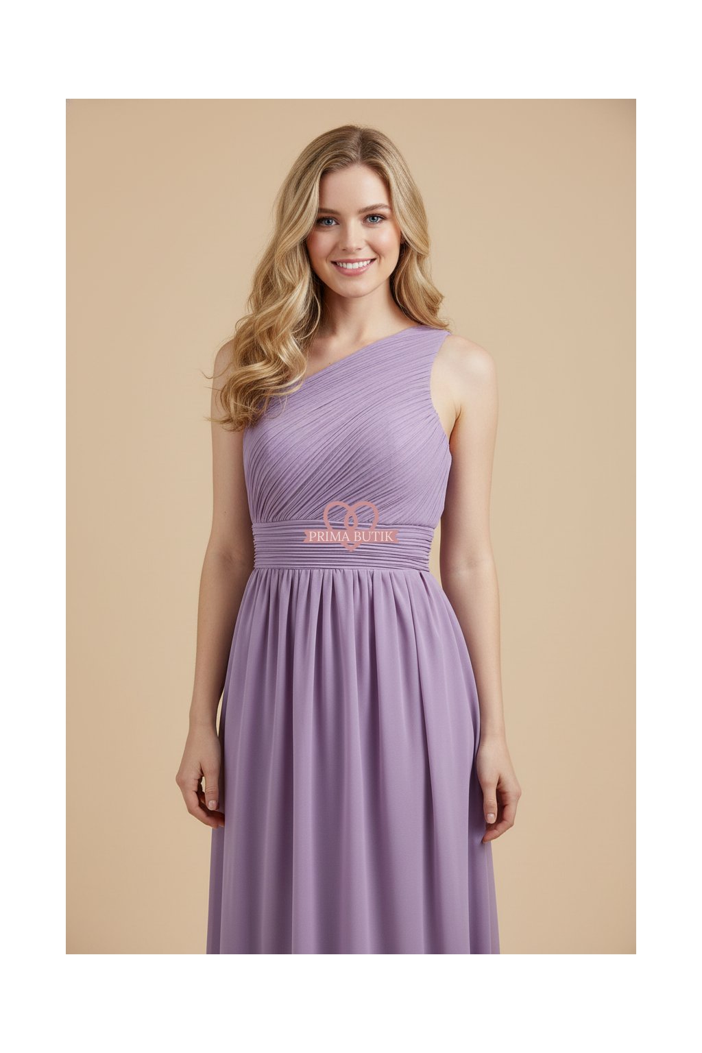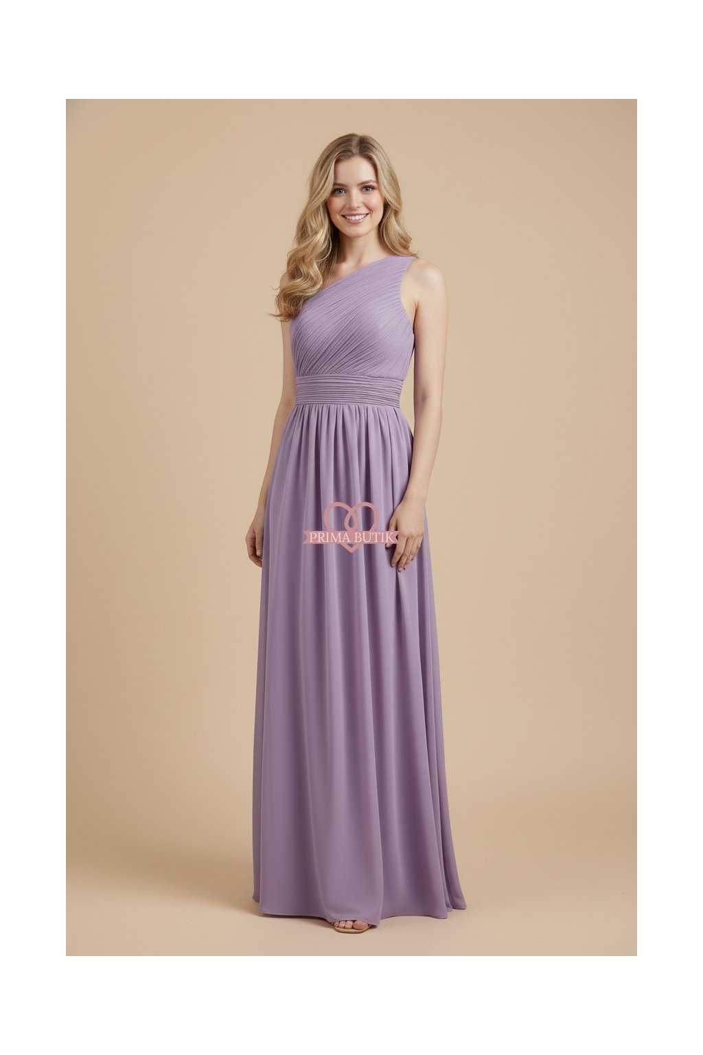 Společenské dlouhé fialové plesové šaty na jedno rameno. Šaty jsou šifónové.