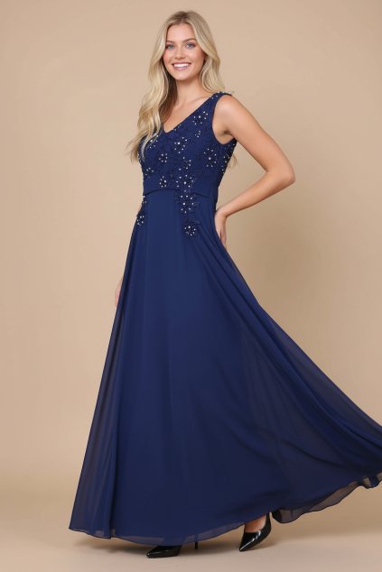 Dlouhé společenské šaty bez rukávů zdobené krajkou. Šaty mají krajkový top a šifonovou sukni a odhalená záda.