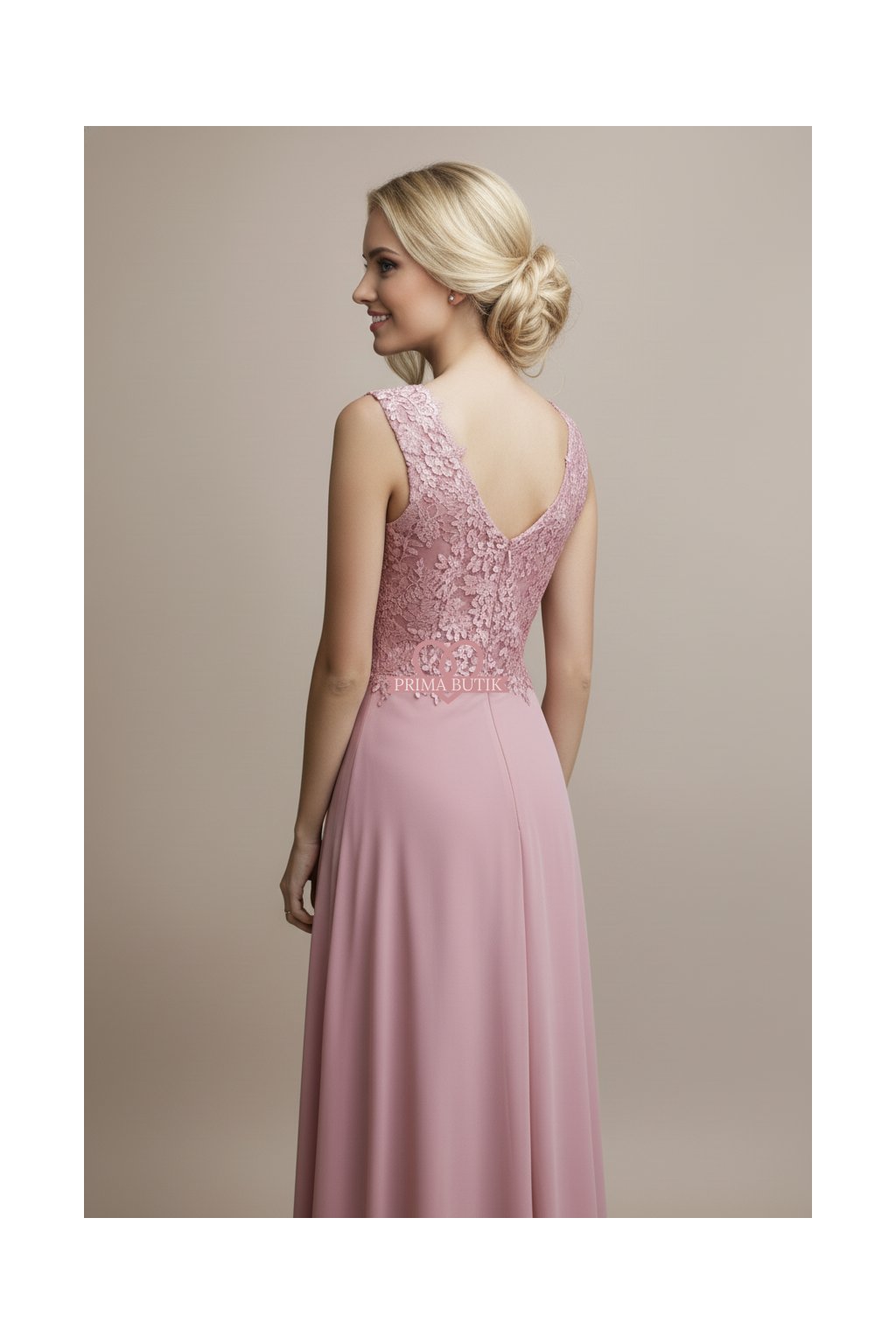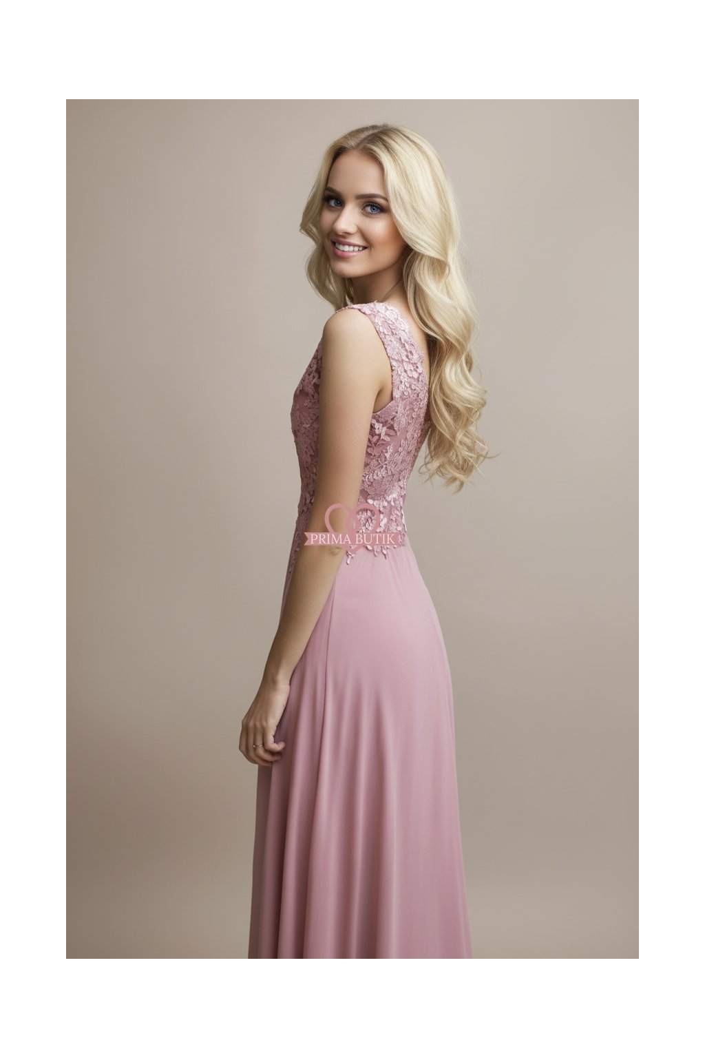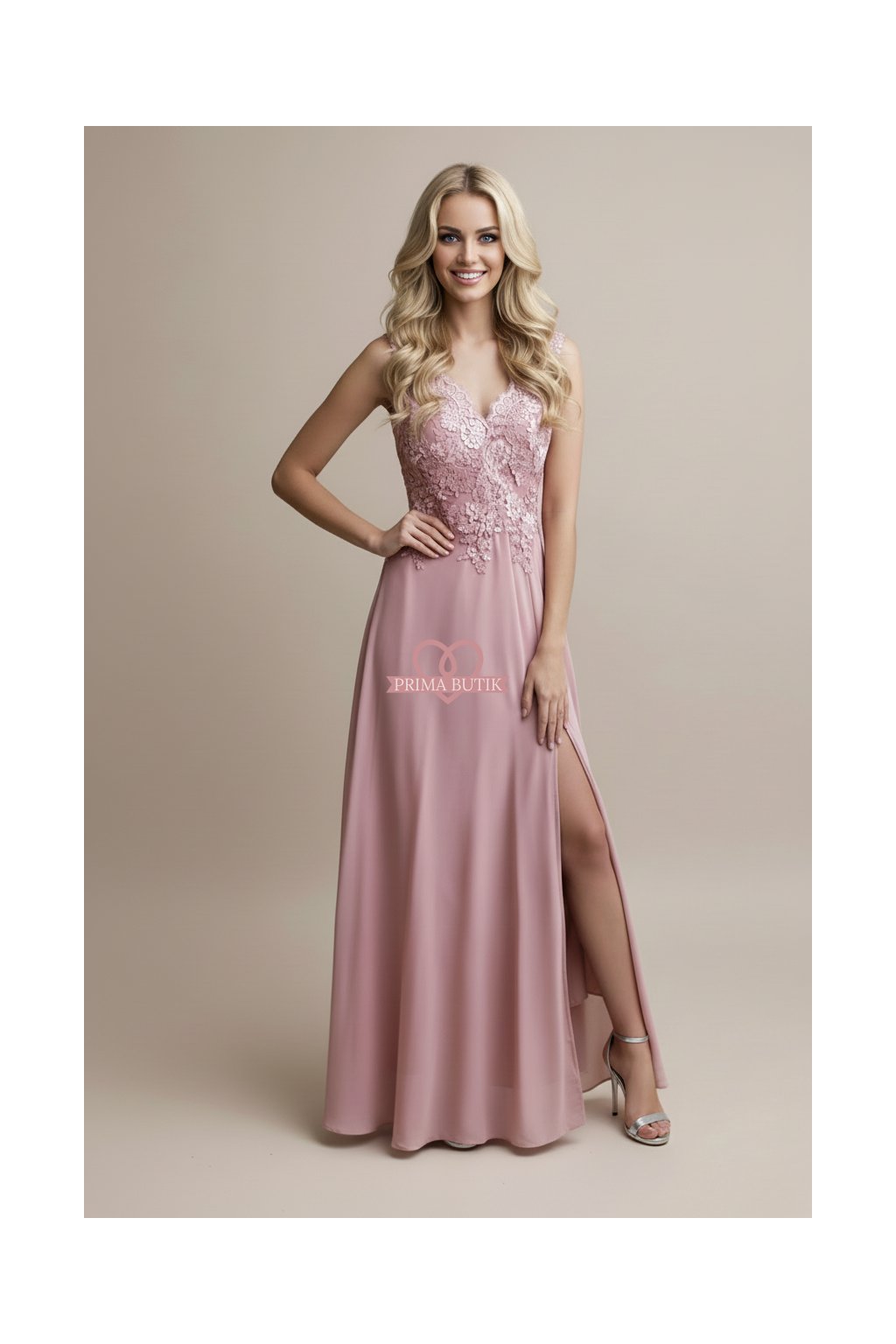 Dlouhé společenské šaty bez rukávů zdobené krajkou. Šaty mají šifónovou sukni s rozparkem.