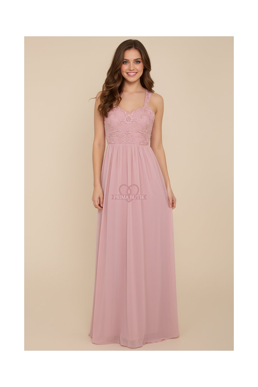 Dlouhé společenské šaty na ples či do tanečních. Šaty jsou bez rukávů s výstřihem do V. Šaty mají top zdobený krajkou a šifónovou sukni, odhalená záda.