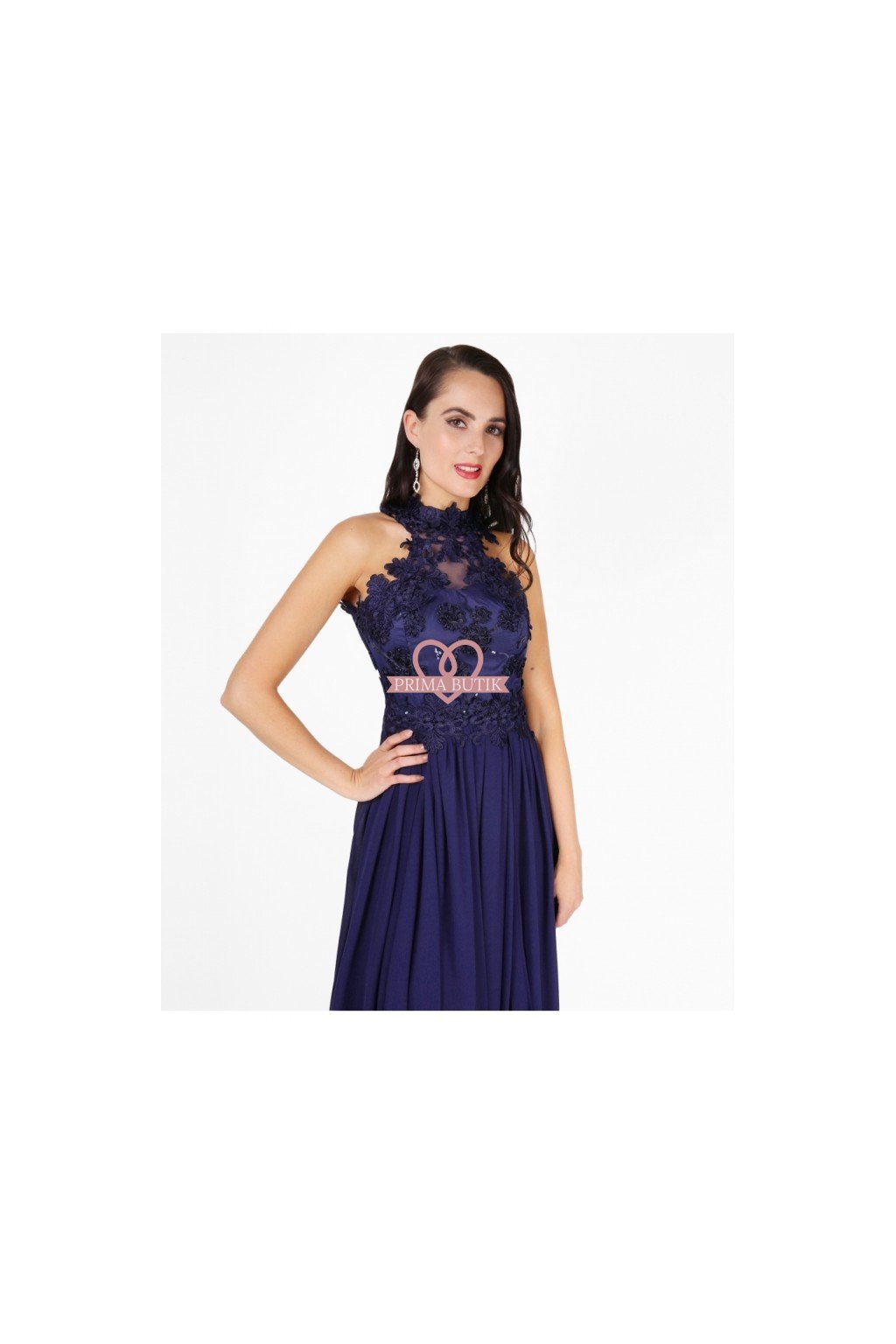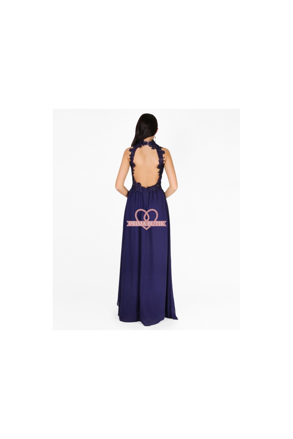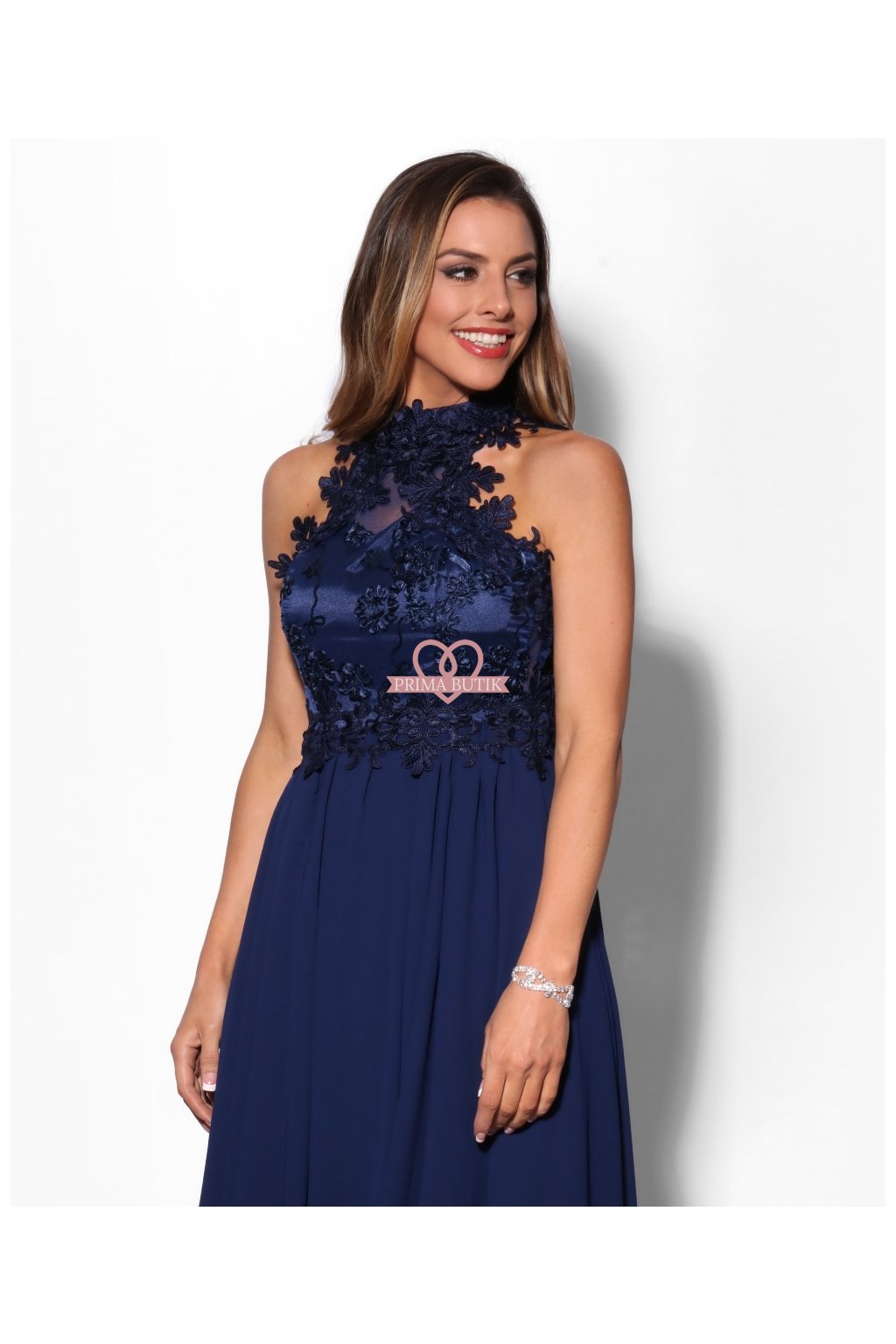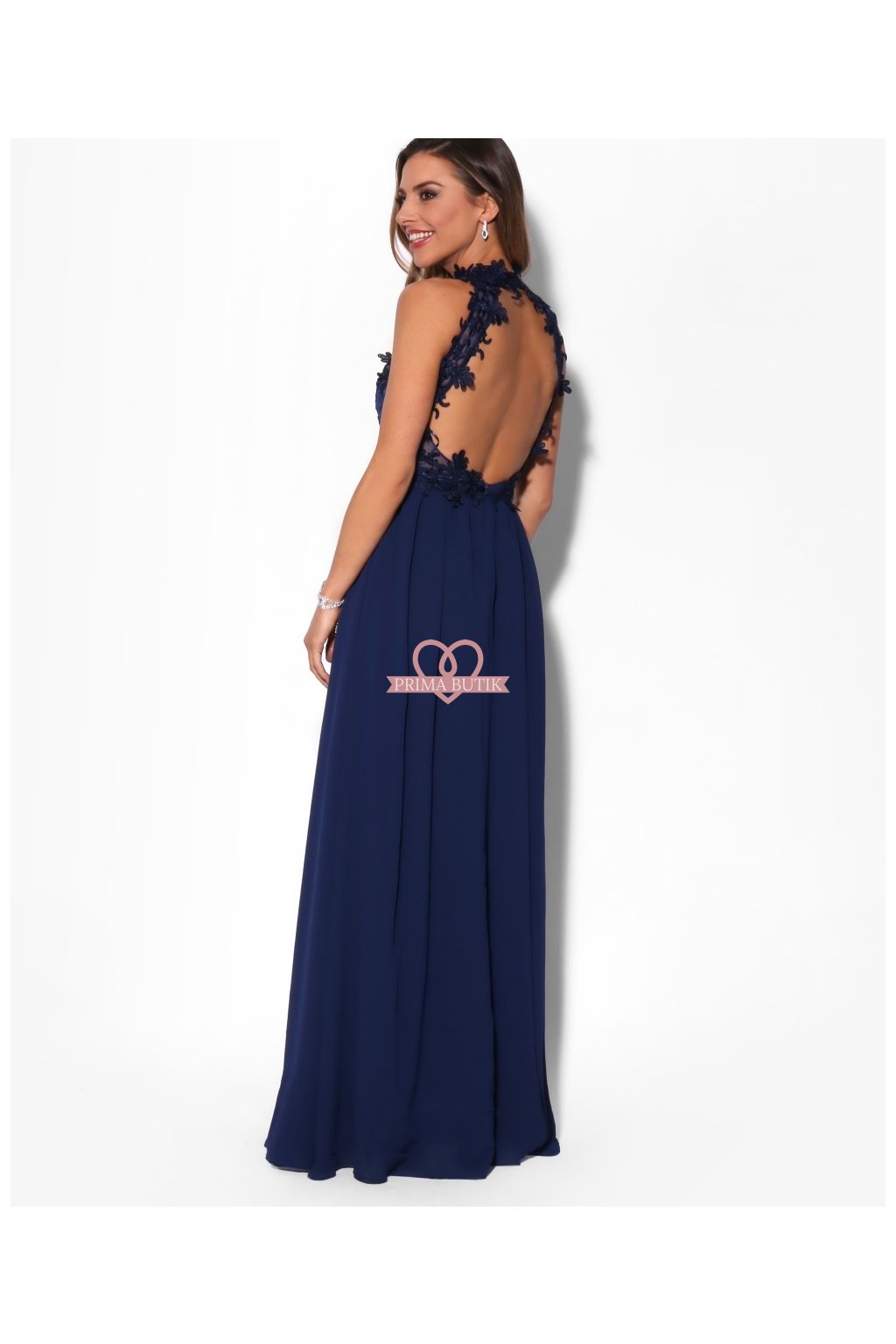 Dlouhé společenské šaty bez rukávů zdobené krajkou. Šaty mají korzetový top se stojáčkem, šifónovou sukni a odhalená záda.