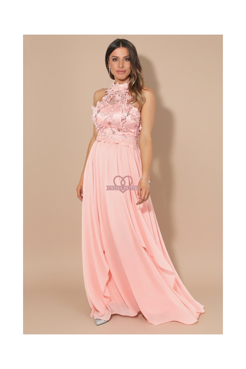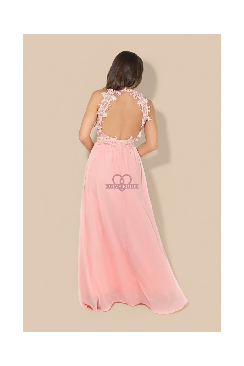 Dlouhé společenské šaty bez rukávů zdobené krajkou. Šaty mají korzetový top se stojáčkem, šifónovou sukni a odhalená záda.