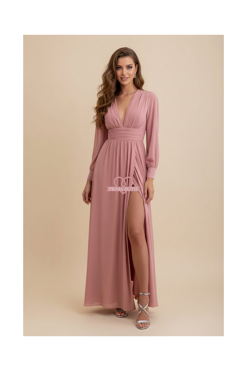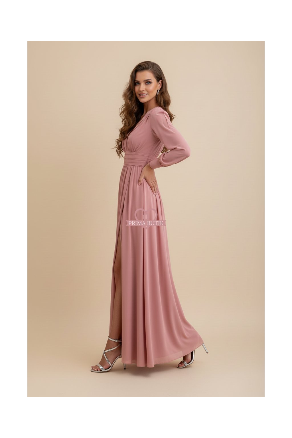 Dlouhé společenské šaty s výstřihem do V. Šaty jsou přes prsa vyztužené.