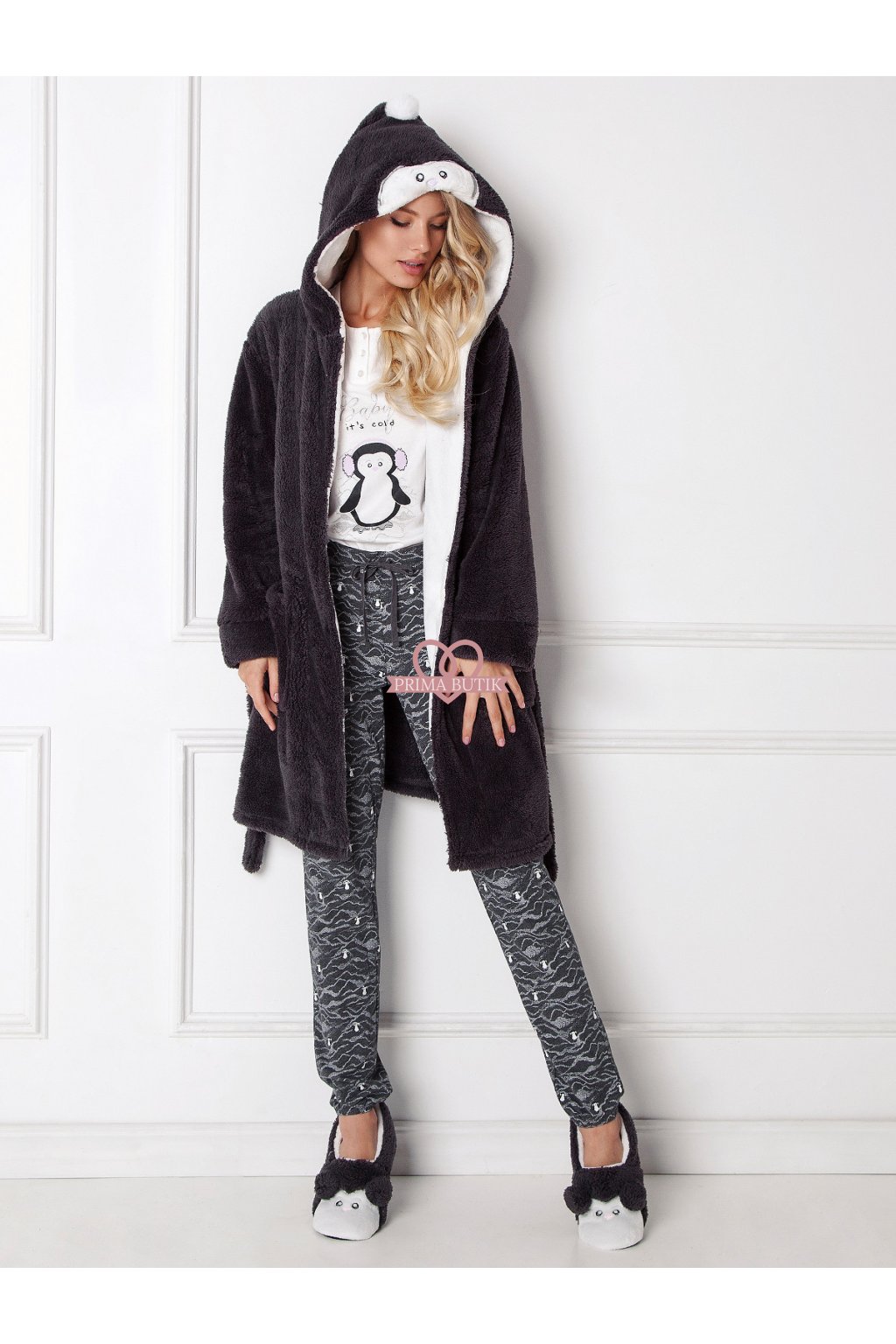 Pantofle vyrobené z měkkého materiálu, zdobené obličejem a ušima tučňáka. Černá protiskluzová textilní podešev. Ideální pro pyžamo Aruelle Arctic Long.Složení: 100% polyester
